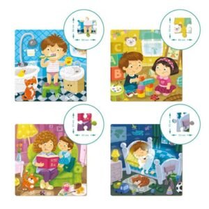 Το Παζλ 4 σε 1 – Καθημερινές Συνήθειες είναι ένα μοναδικό εκπαιδευτικό παιχνίδι που περιλαμβάνει τέσσερις διαφορετικές σκηνές από την καθημερινότητα των παιδιών. Με συνολικά 72 κομμάτια, τα παιδιά μπορούν να ανακαλύψουν και να κατανοήσουν βασικές δραστηριότητες της ημέρας, όπως το πρωινό ξύπνημα, το φαγητό, το παιχνίδι και την ώρα του ύπνου.