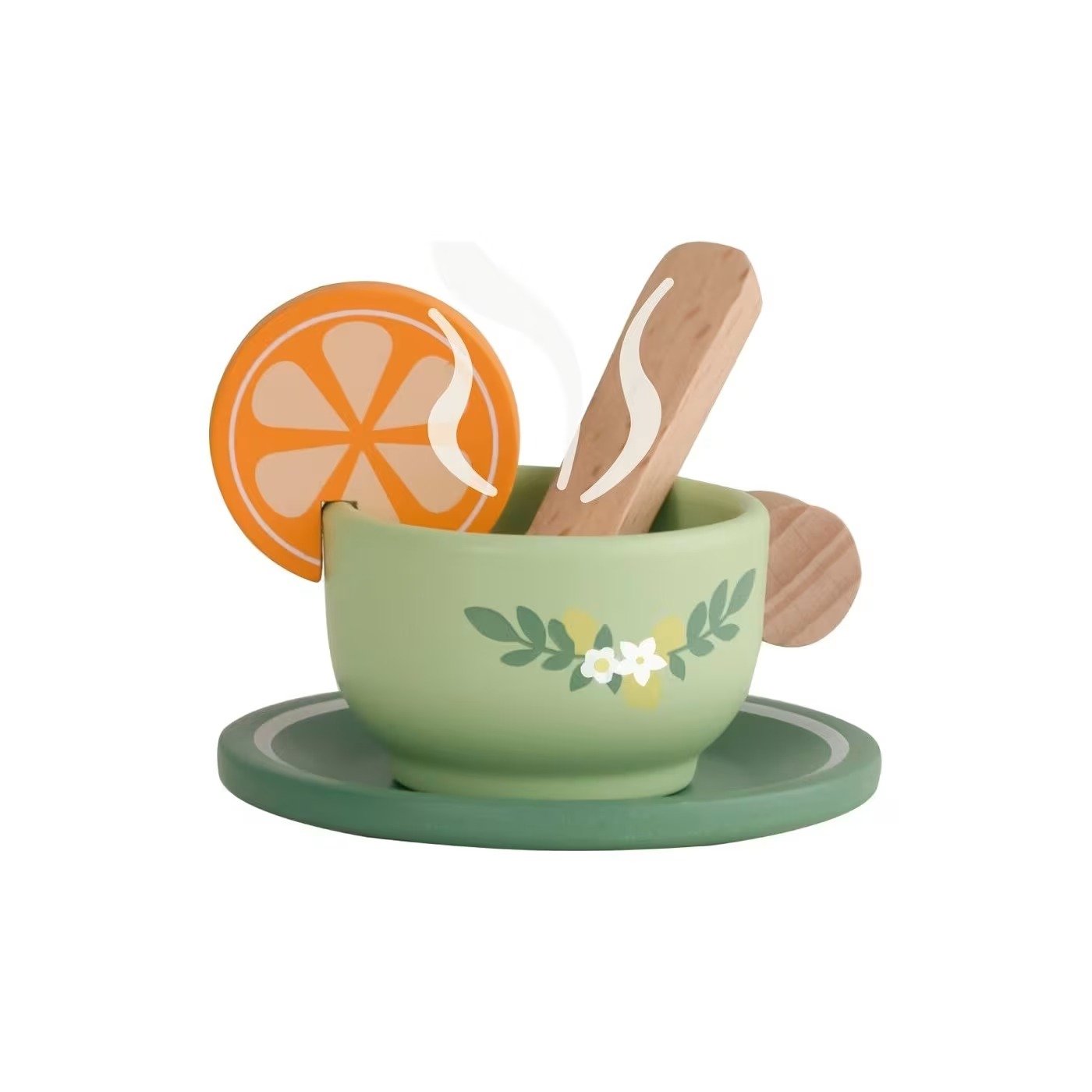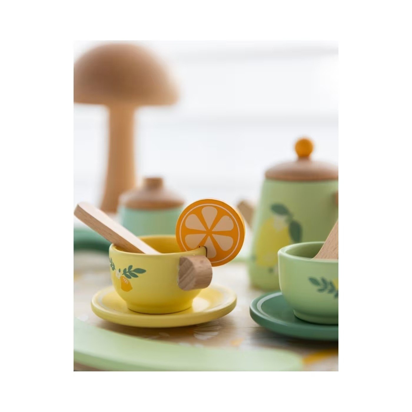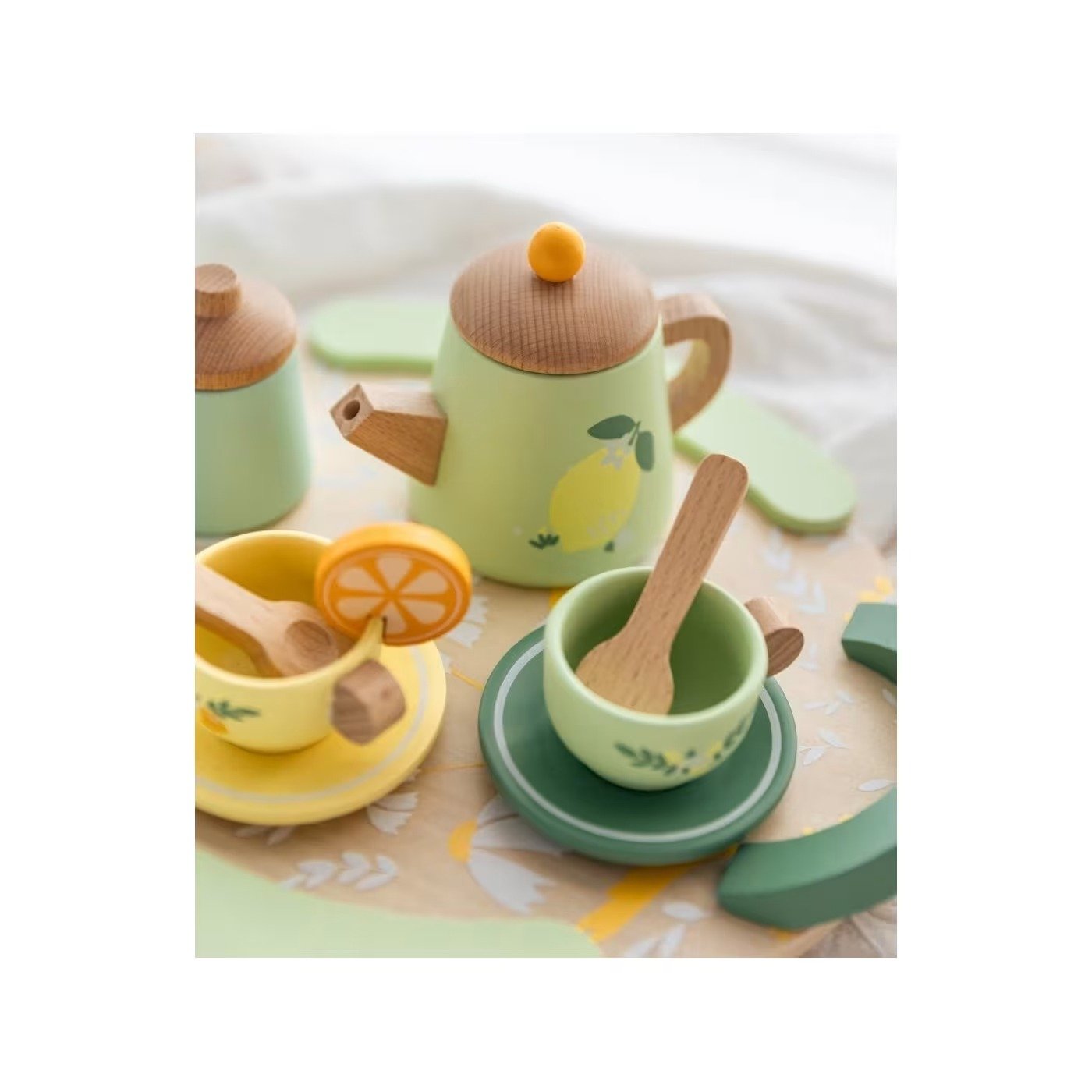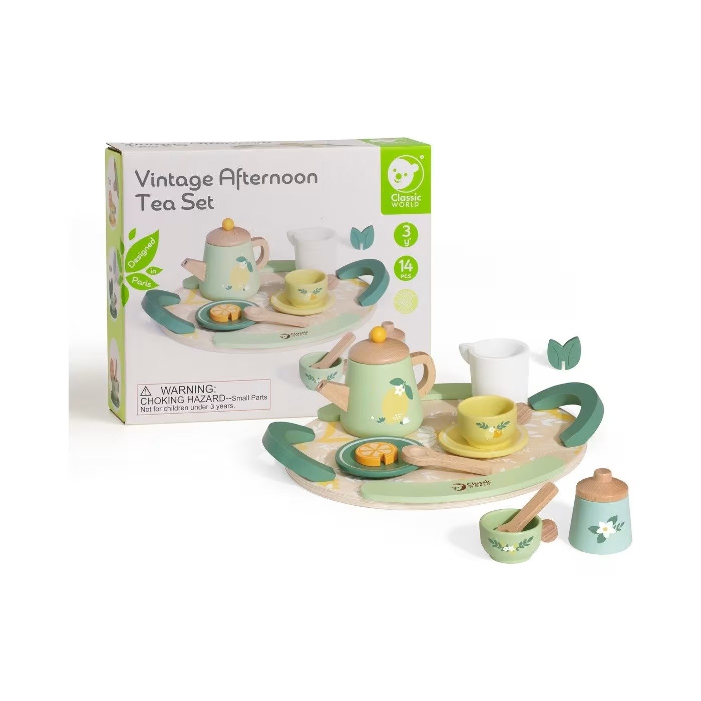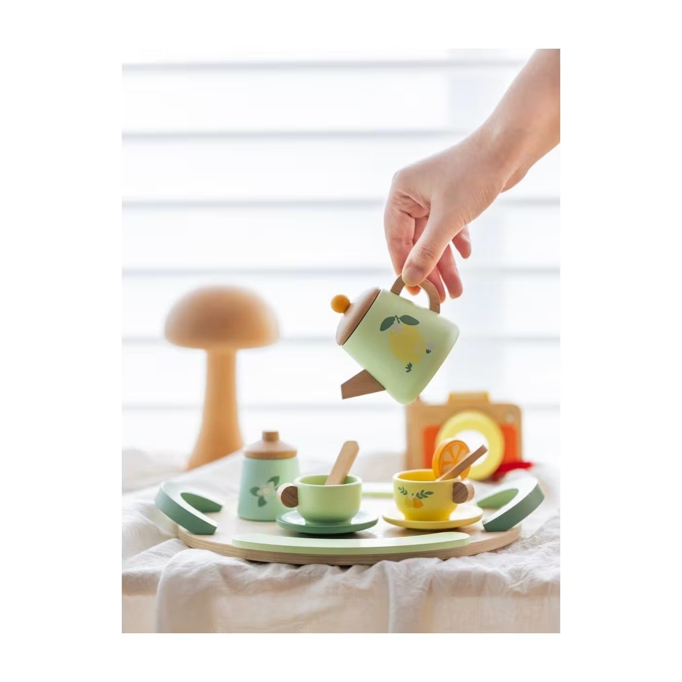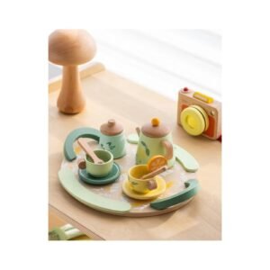 Παιδικό ξύλινο σετ τσαγιού σε vintage στυλ με αξεσουάρ για παιχνίδι ρόλων και δημιουργική απασχόληση.