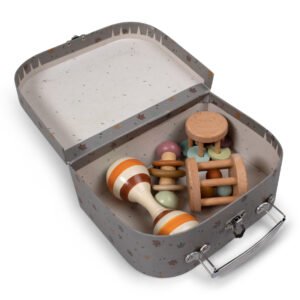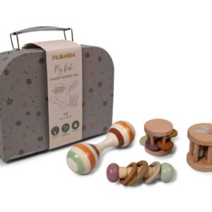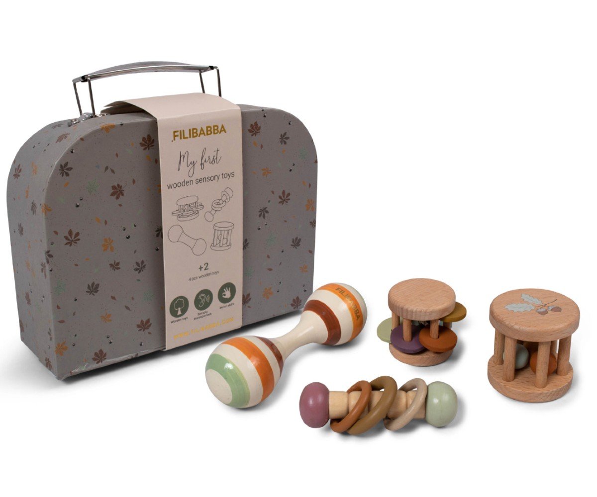 Ανακαλύψτε το ιδανικό δώρο για την ανάπτυξη των αισθήσεων του μωρού σας! Αυτό το γλυκό βαλιτσάκι με αισθητηριακά παιχνίδια επιτρέπει στο παιδί να εξερευνήσει ήχους, χρώματα και συναρπαστικές επιφάνειες. Το σετ περιλαμβάνει τέσσερα αισθητηριακά παιχνίδια από ξύλο οξιάς, ενώ το ίδιο το βαλιτσάκι είναι κατασκευασμένο από ανθεκτικό χαρτόνι, διακοσμημένο με το πανέμορφο print “Chestnuts” με τα πολύχρωμα φύλλα.