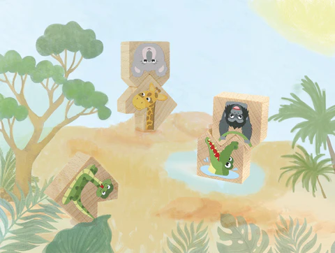 Τα εξωτικά ζώα έχουν γίνει ακροβάτες, ικανά να περπατούν στα αυτιά τους, να πηδούν το ένα στην πλάτη του άλλου και, όταν κουραστούν, ξαπλώνουν και παίζουν ένα παιχνίδι μνήμης. Δημιουργήστε τις δικές σας συνθέσεις ή εμπνευστείτε από το φυλλάδιο οδηγιών.