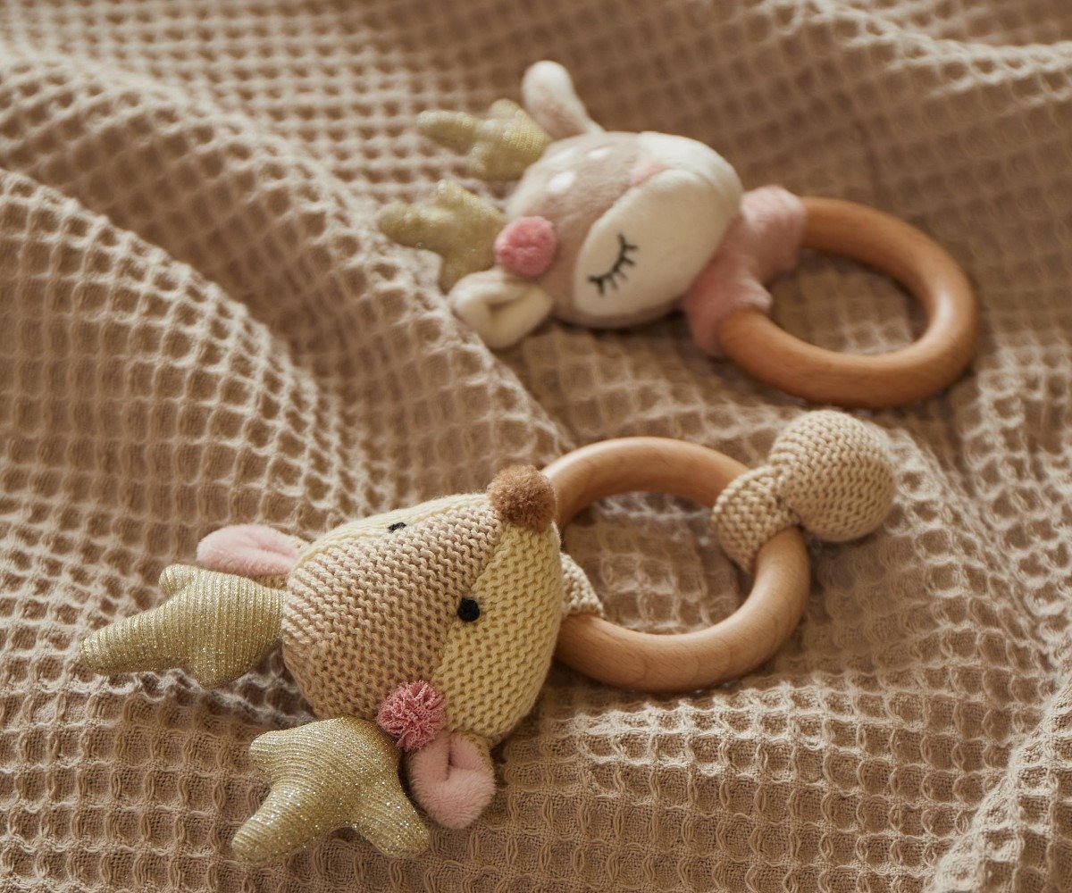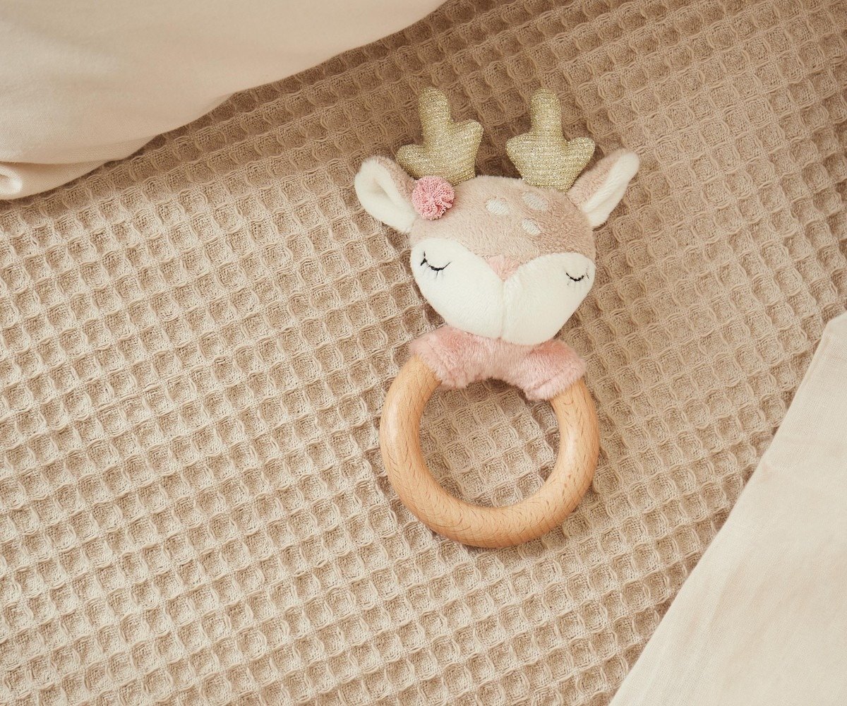 Αισθητηριακός Συνδυασμός: Ο συνδυασμός του φυσικού ξύλινου κρίκου με το απαλό λούτρινο ύφασμα προσφέρει μια ενδιαφέρουσα εναλλαγή υφών, η οποία διεγείρει την αίσθηση της αφής και είναι εξαιρετικά ευχάριστη στα μικρά χεράκια.