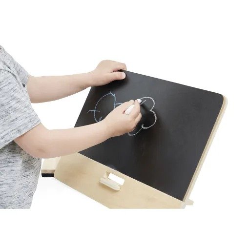 Ο πίνακας διακρίνεται για την ευχρηστία του, καθώς η βάση του διπλώνει εύκολα αφαιρώντας απλώς ένα από τα δύο κουμπιά (press studs) στη υφασμάτινη λαβή. Το διαχρονικό στυλ σχιστόλιθου προσδίδει μια κλασική αισθητική, ενώ τα παρελκόμενα που περιλαμβάνονται επιτρέπουν στο παιδί να ξεκινήσει αμέσως τη δημιουργία.